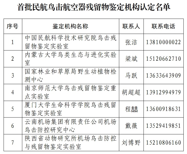 为进一步规范鸟击航空器残留物物种鉴定工作,提升鸟击防范及相关事件调查的能力水平,根据《鸟击航空器残留物鉴定机构管理办法》的有关要求,在各鉴定机构自主申报、专家评选的基础上,民航局按照相关工作程序确定了首批7家民航鸟击航空器残留物鉴定机构认定名单,现予以公布。